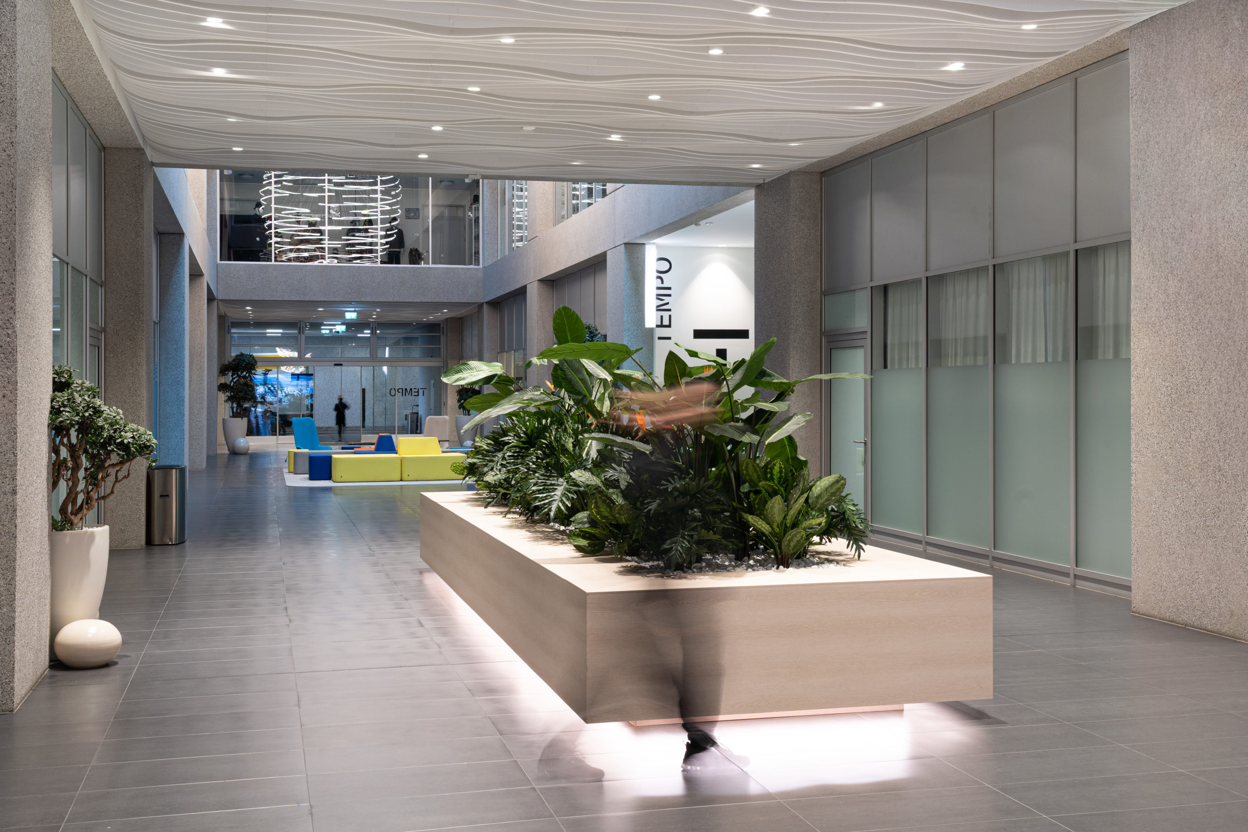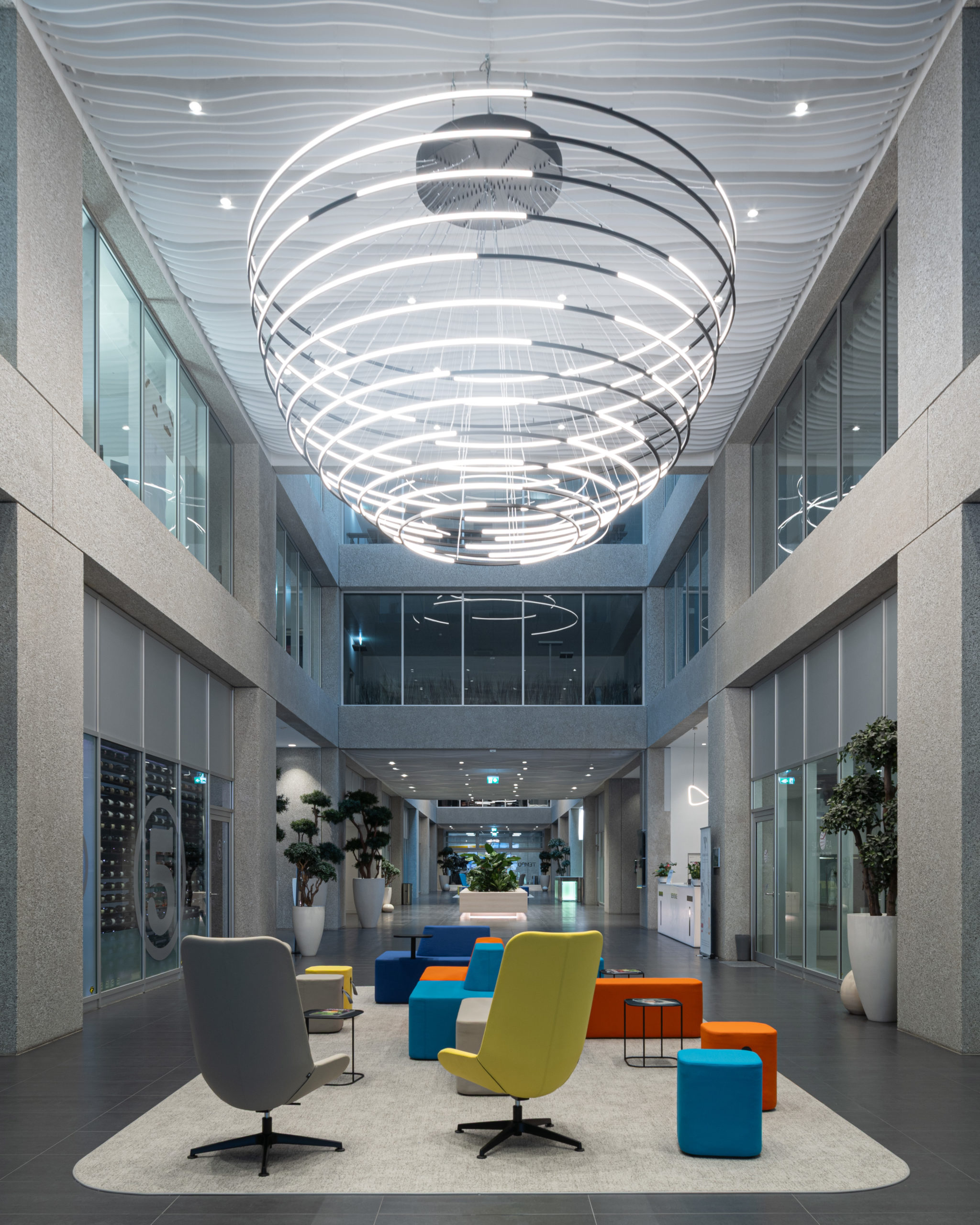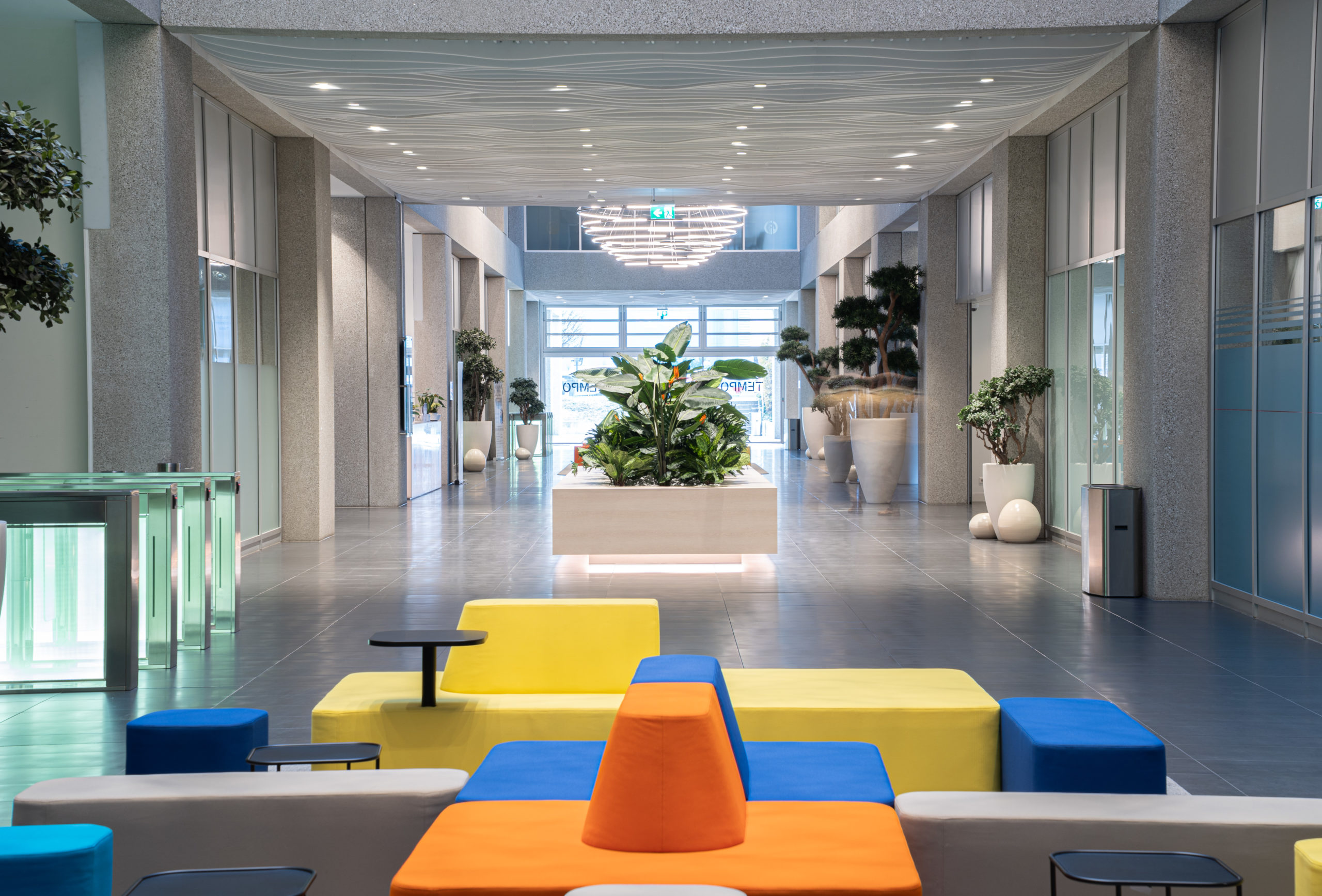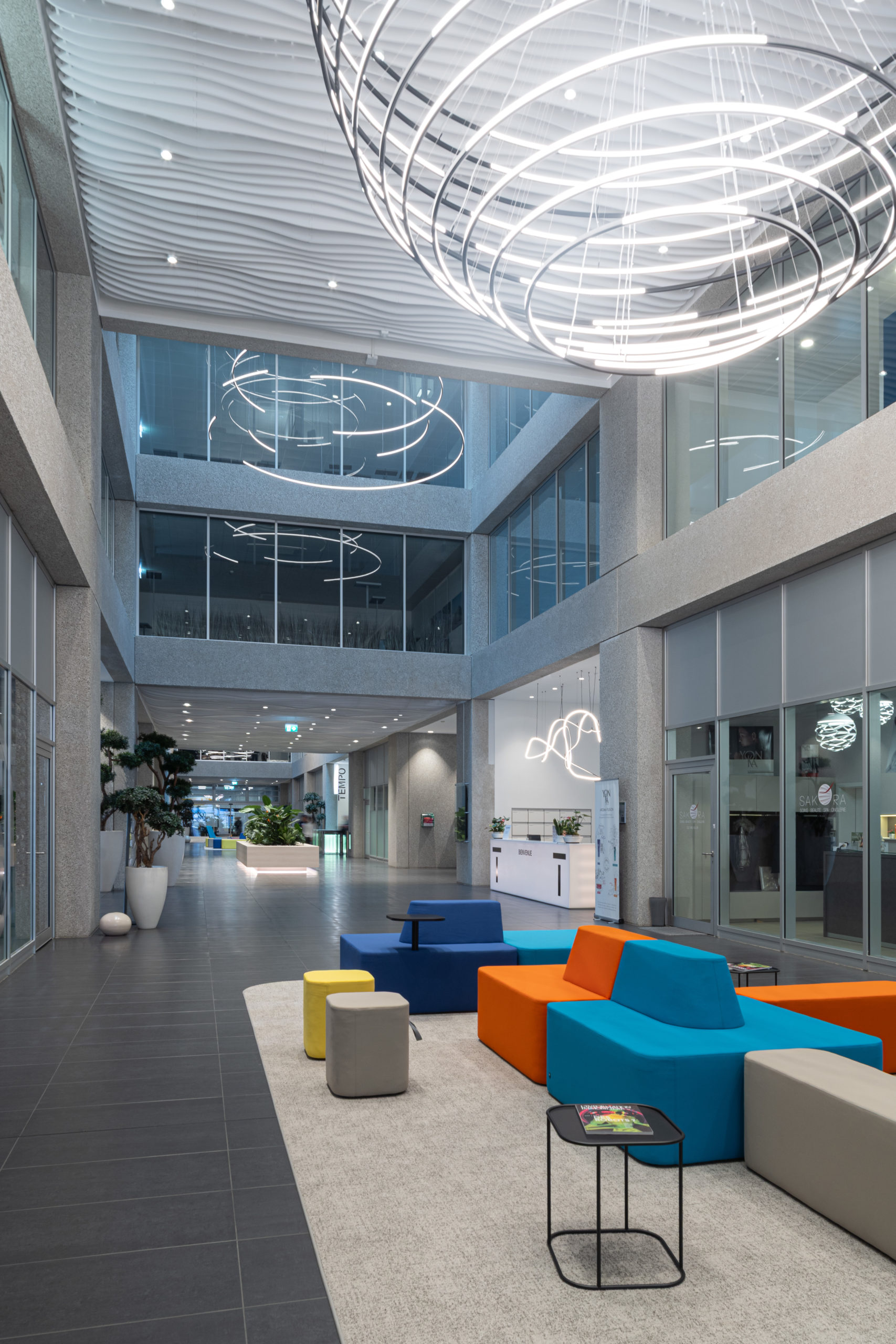 Afin de donner une identité forte à TEMPO Geneva, nous avons développé une scénographie intérieure complète mêlant lumière, design et fonctionnalité. La pose et la mise en valeur de luminaires signature ont été spécialement pensées pour dialoguer avec les volumes impressionnants de l’atrium et structurer l’ensemble des espaces. Nous avons également conçu et aménagé le mobilier central ainsi que la zone de réception, afin de créer une ambiance vivante, chaleureuse et immédiatement identifiable dès l’entrée dans le bâtiment. La signalétique, élégante et parfaitement intégrée à l’univers visuel du site, a été réalisée pour offrir une orientation fluide et intuitive à tous les utilisateurs.