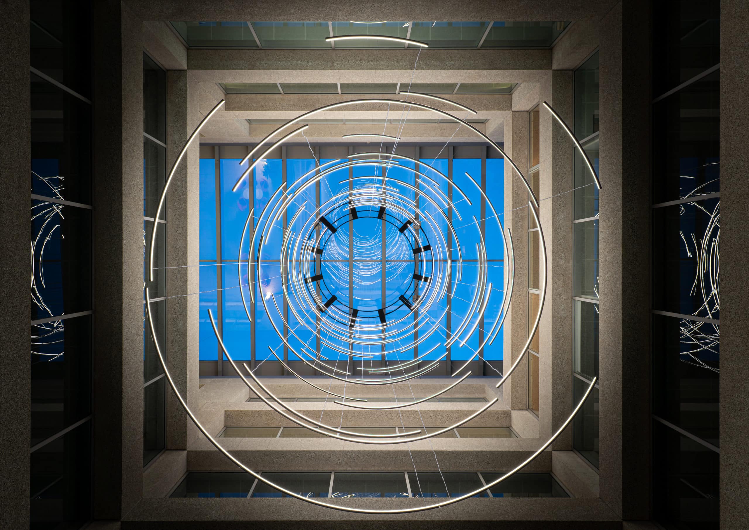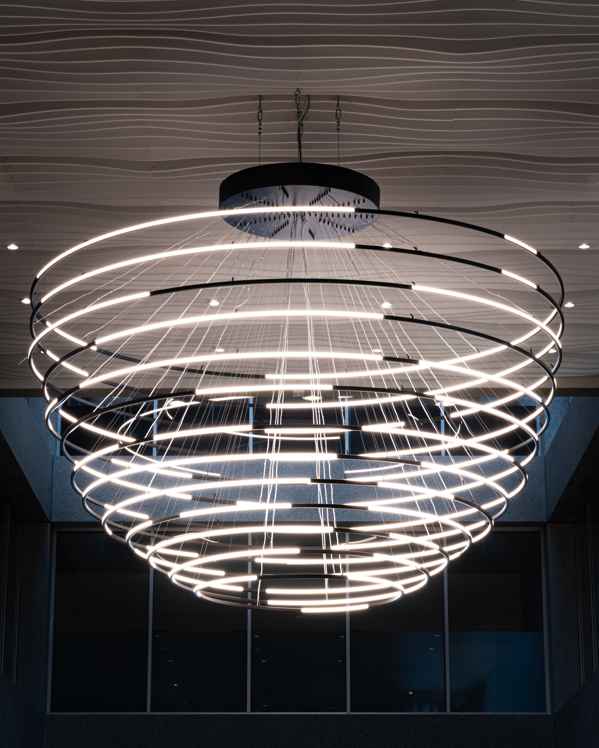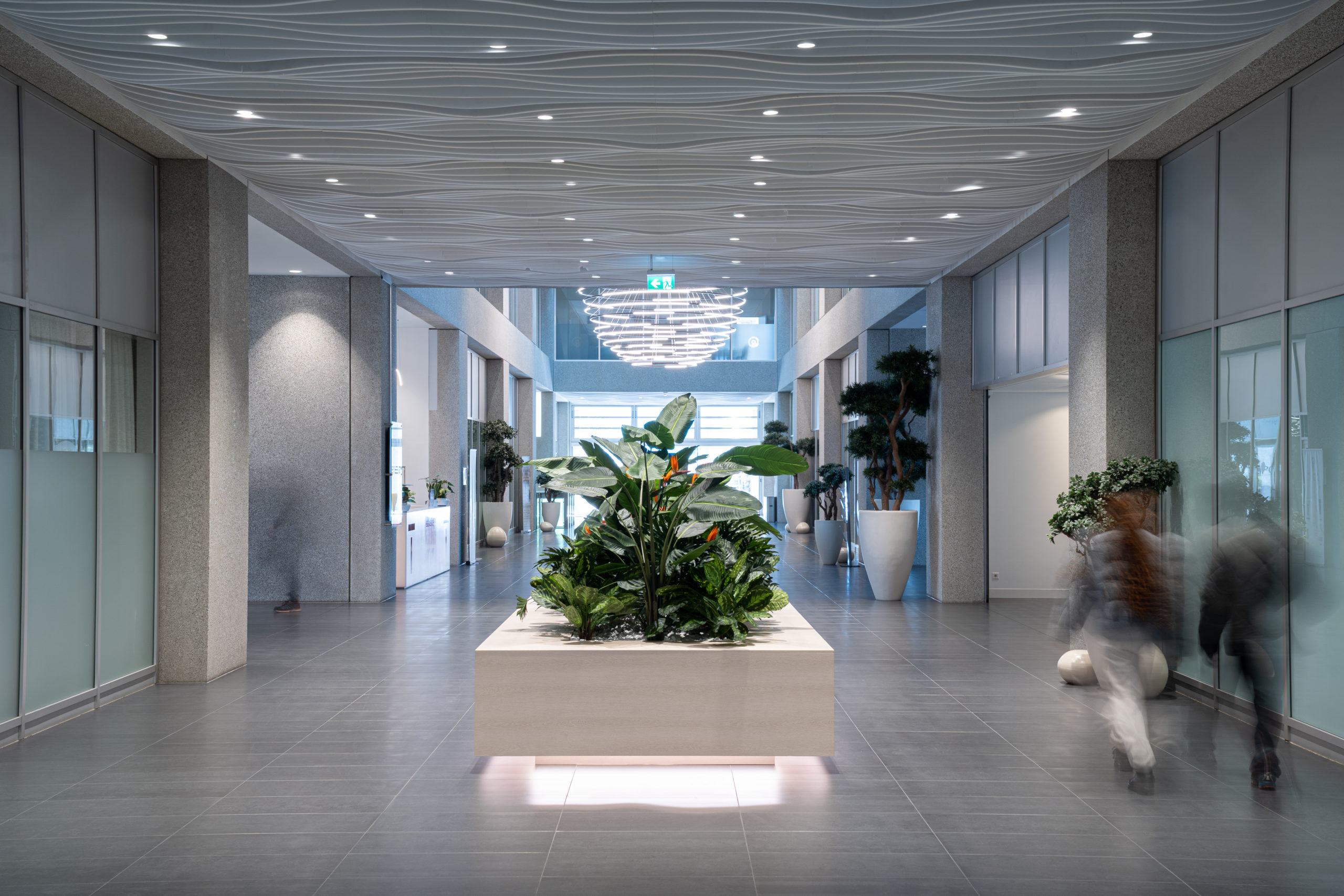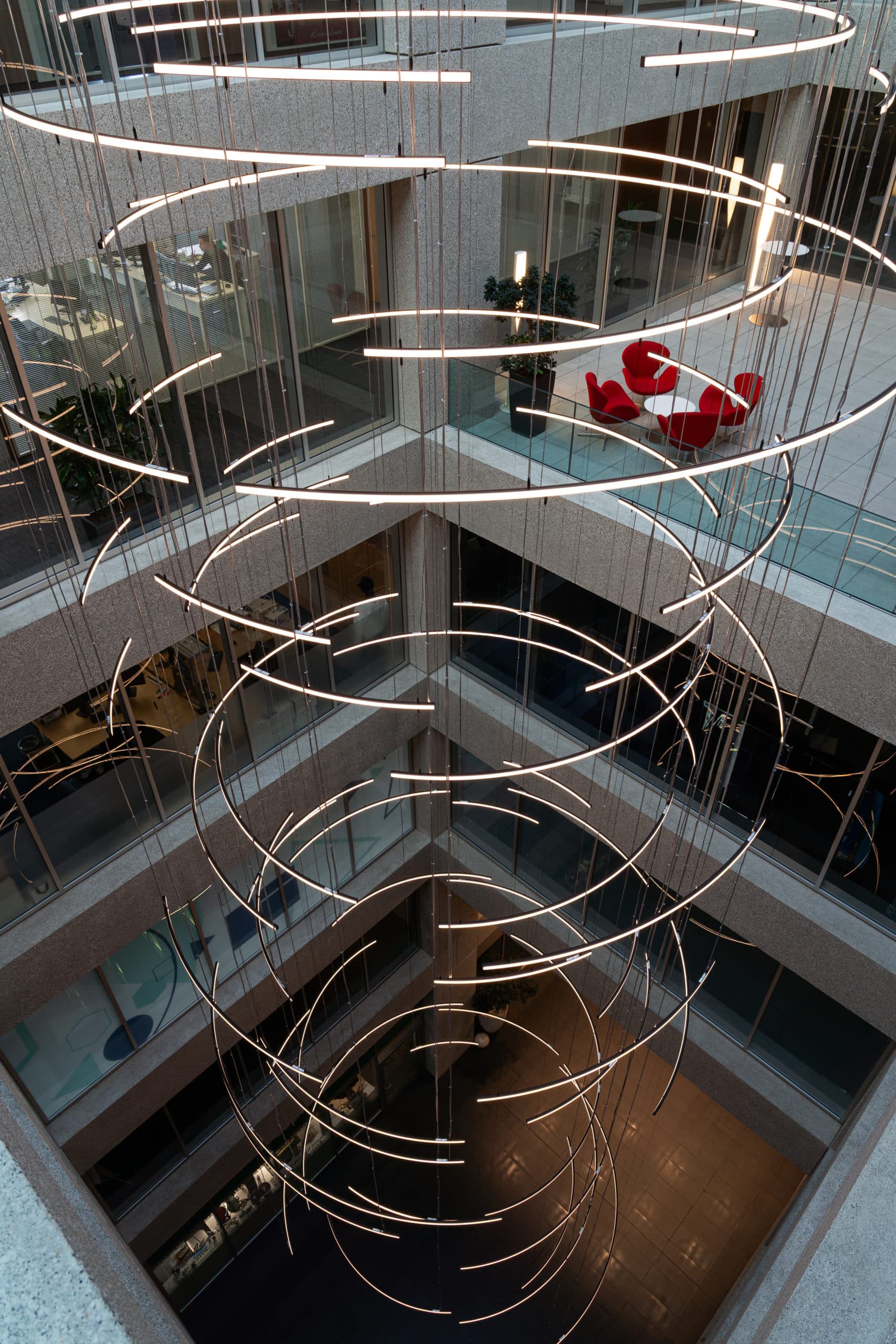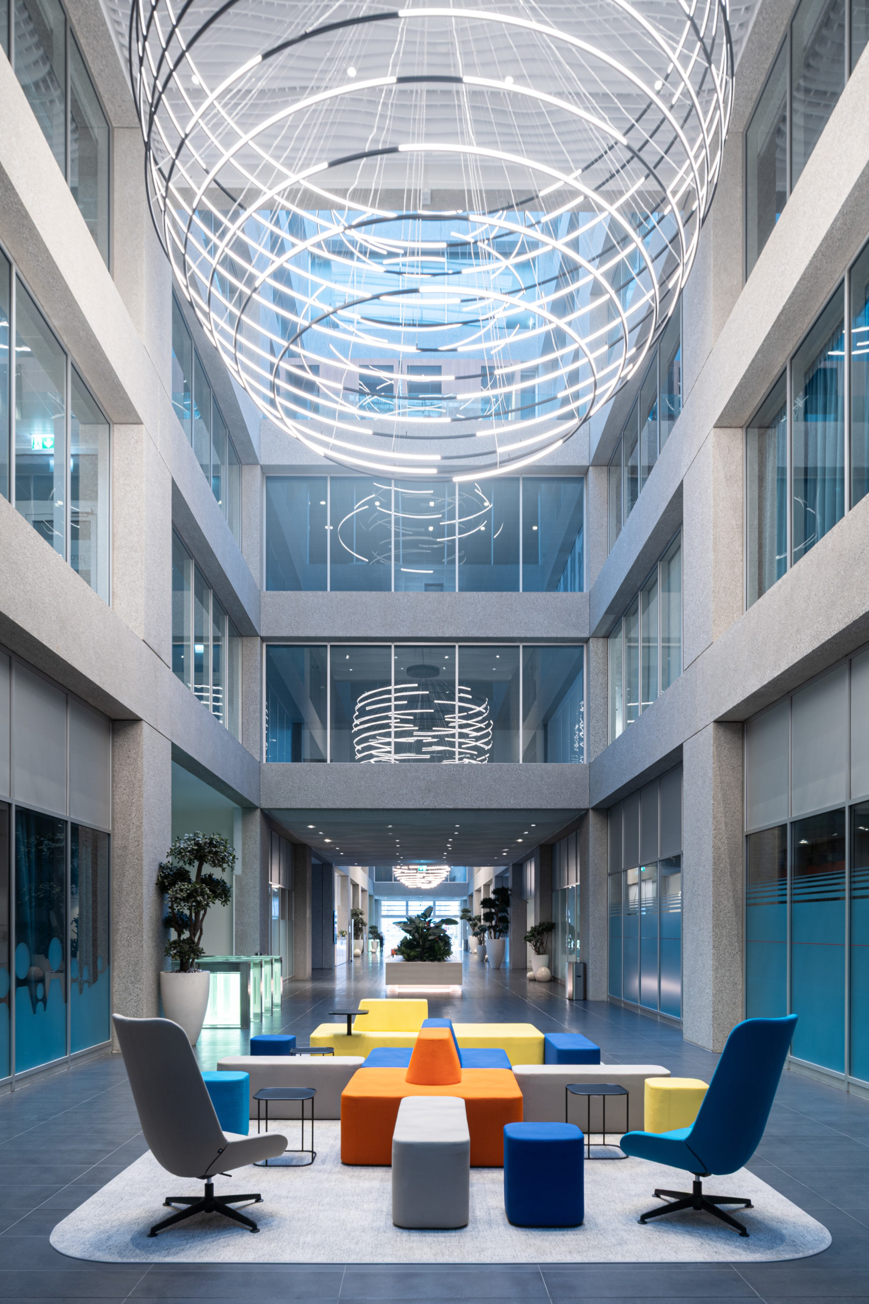 Afin de donner une identité forte à TEMPO Geneva, nous avons développé une scénographie intérieure complète mêlant lumière, design et fonctionnalité. La pose et la mise en valeur de luminaires signature ont été spécialement pensées pour dialoguer avec les volumes impressionnants de l’atrium et structurer l’ensemble des espaces. Nous avons également conçu et aménagé le mobilier central ainsi que la zone de réception, afin de créer une ambiance vivante, chaleureuse et immédiatement identifiable dès l’entrée dans le bâtiment. La signalétique, élégante et parfaitement intégrée à l’univers visuel du site, a été réalisée pour offrir une orientation fluide et intuitive à tous les utilisateurs.